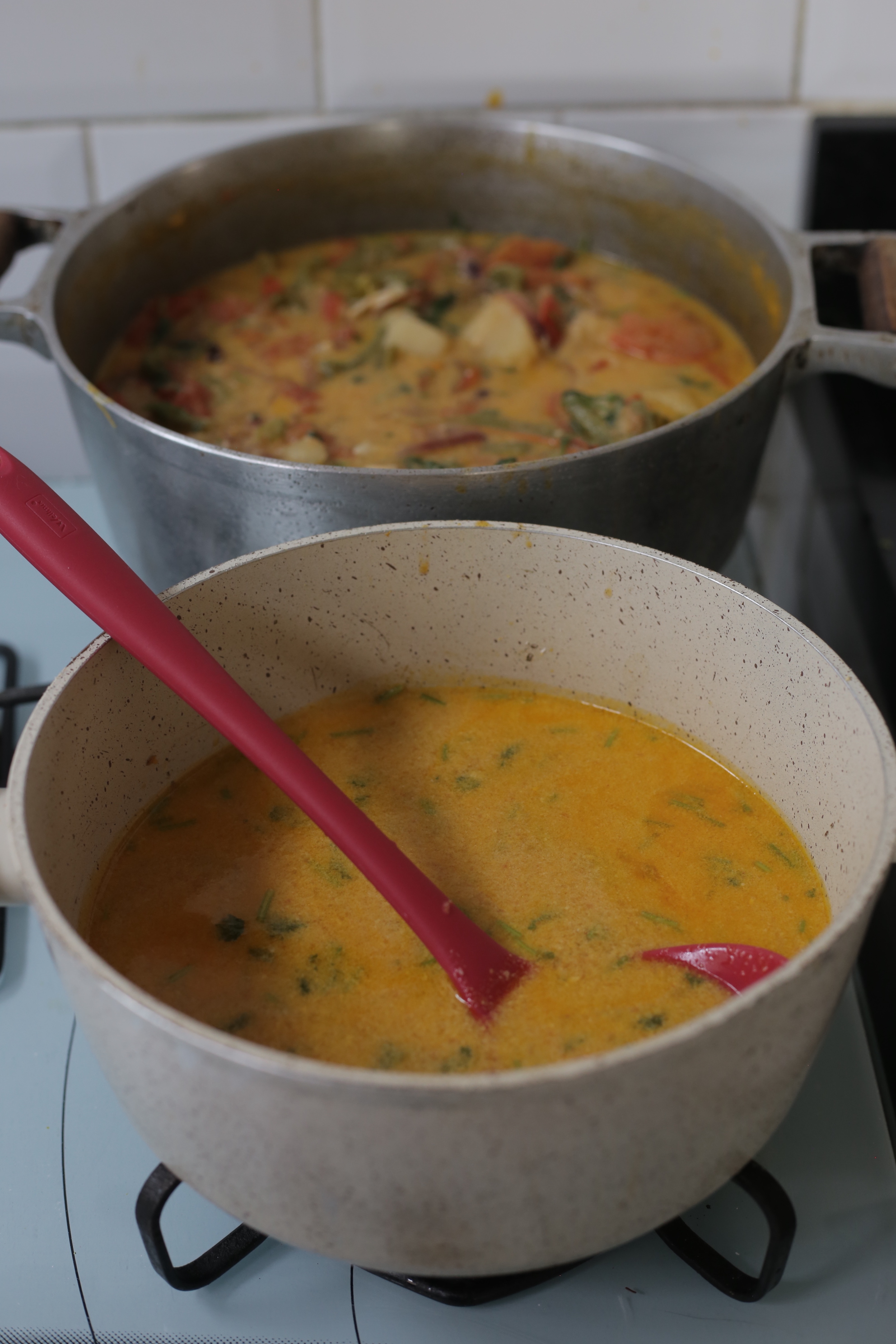 Quando a moqueca estiver cozida retire uma parte do caldo (pode vir com pedacinhos dos vegetais) e transfira pra uma panela menor pra fazer o pirão. Deixe amornar, junte um pouco de farinha de mandioca, uma pitada generosa de sal e misture com um batedor de arame pra desfazer os grumos. Leve ao fogo pra engrossar, mexendo sem parar com uma colher de pau. Prove e corrija o sal, se necessário. Tem quem goste de pirão fino (eu!) e quem goste de pirão grosso. Adapte a quantidade de farinha pro seu gosto.