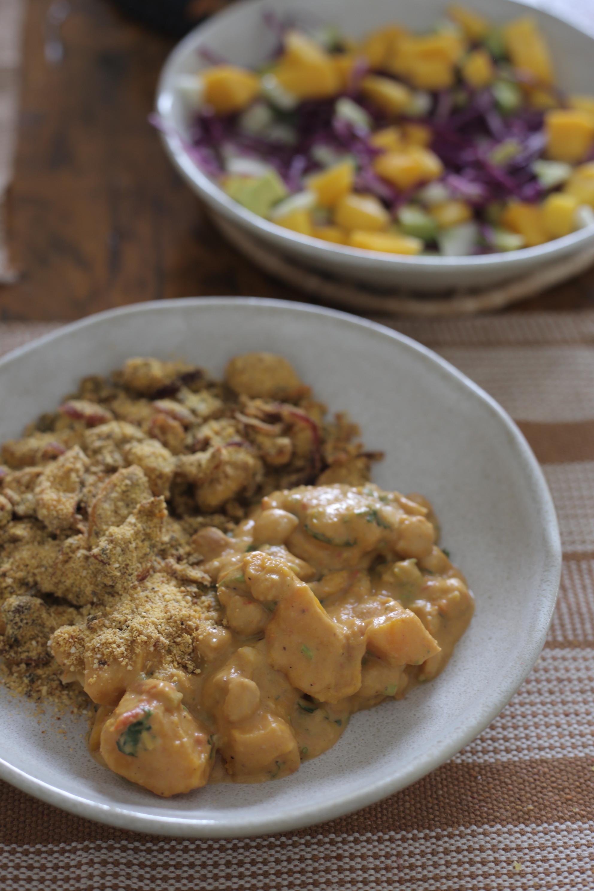 Acho que amendoim, essa leguminosa nativa do território conhecido como Brasil, não recebe a atenção que merece na nossa culinária. Por isso estou sempre com a colher preparada pra jogar pasta de amendoim na panela e criar molhos untuosos e saborosos. Foi o que aconteceu aqui. Meu jerimum refogado recebeu esse tratamento especial e ainda incluí um resto de grão de bico cozido que estava na geladeira. Esses três ingredientes se dão muito bem juntos, e tudo fica ainda melhor com coentro. Além de nos fartamos no almoço, os restos desse prato podem virar um recheio de tapioca (ou pão) maravilhoso no dia seguinte.