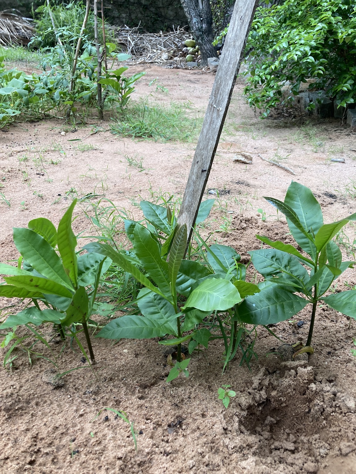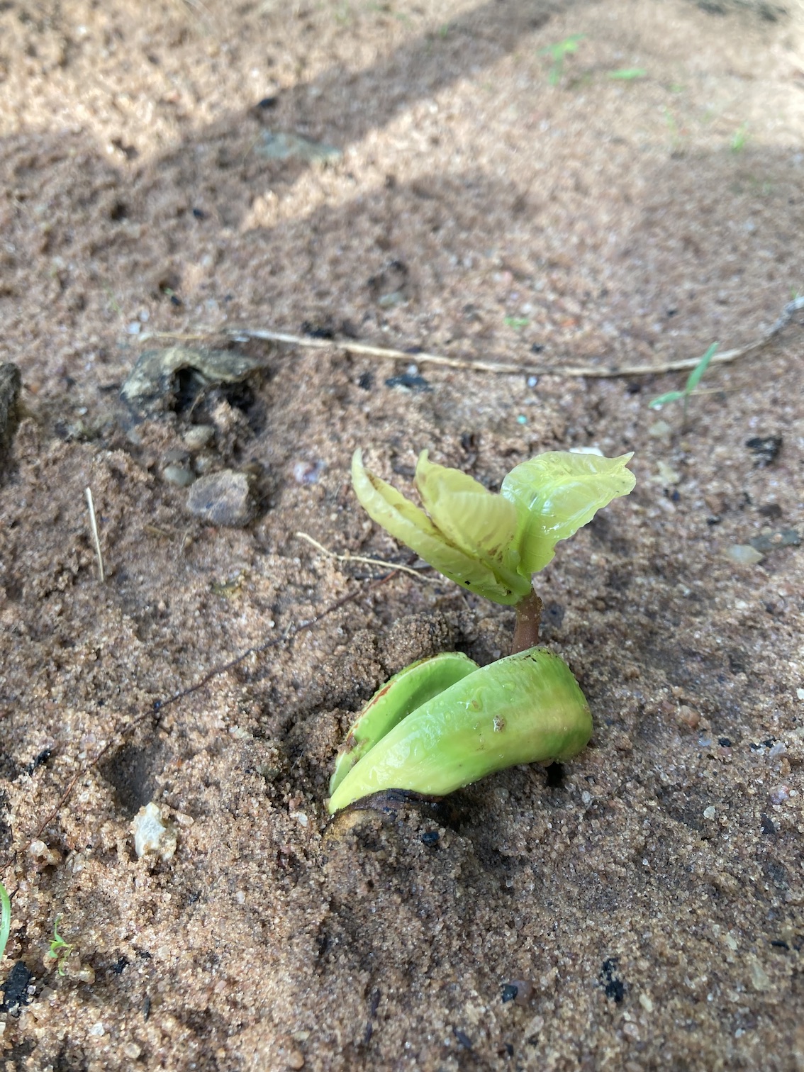 Gostaria de ter um quintal produtivo, mas até agora não consegui materializar esse desejo, então, por enquanto, minha roça de quintal é um espaço de experimentação. Plantei as castanhas dos melhores cajus que provei nessa safra e, pro meu maravilhamento, nasceram lindos cajueirinhos. Depois de selecionar os mais bonitos e fortes, tem quatro mudas crescendo em lugares diferentes (depois vou fazer outra seleção e deixar só um cajueiro). Olha que coisa mais fofa uma castanha germinada com o brotinho de cajueiro despontando!