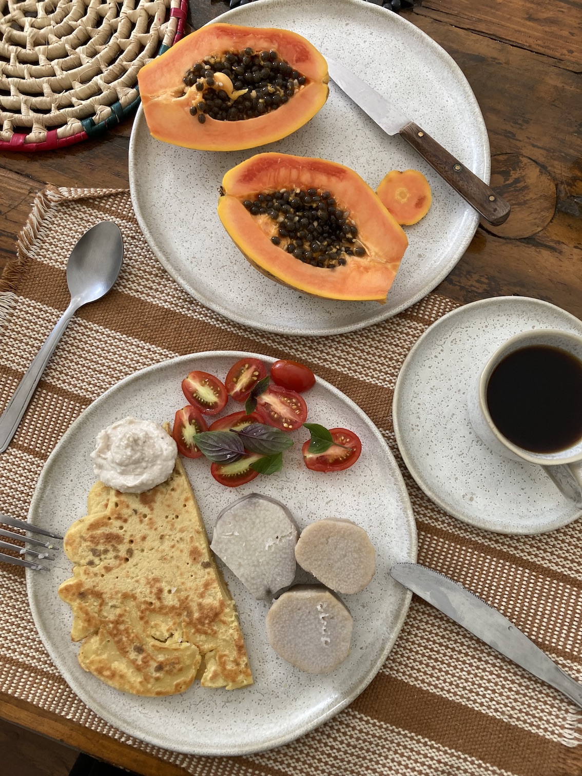 Outra pequena alegria quotidiana pra mim, e prioridade na minha lista der responsabilidades comigo mesma: comer bem. À esquerda: café da manhã de um dia qualquer, com cará cozido, grãomelete fermentado, queijo de castanha fermentado, tomate cereja com manjericão da minha horta, café e mamão. À direita: almoço de um dia qualquer, com risoto de arroz da terra e legumes, feijão verde, salada de folhas, repolho roxo, manga e sementes de jerimum e girassol torradas. Abaixo: almoço de um dia especial, com macaco recheado com banana jasmim grelhada, purê de jerimum puxado no queijo de castanha, maxixe numa redução de tucupi e mel de caju e salada de caju, pepino e coentro.