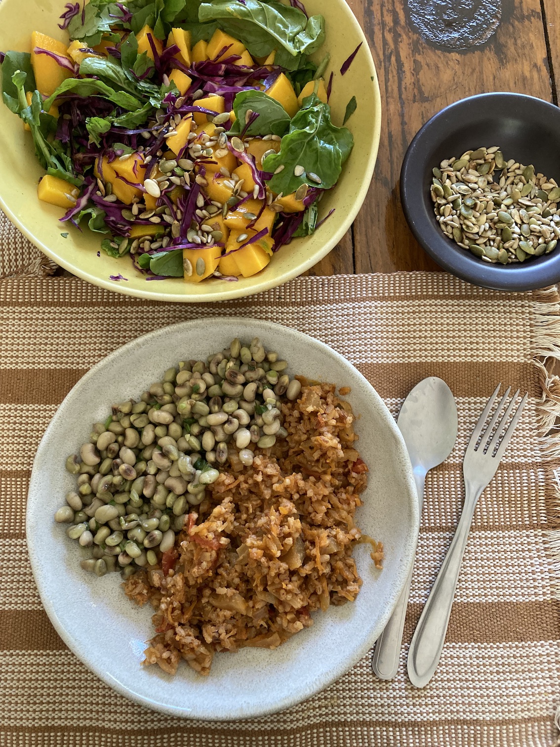 Café da manhã: esqueci de fotografar, mas foi minha amada aveia dormida com maçã. Almoço: mexidão de arroz integral com proteína de soja temperada com tomate e ervilha torta (da nossa horta), salada com mâche (um tipo de alface), pepino, rabanete preto e chucrute. Jantar: macarrão integral com molho de tomate, abobrinha e queijo de tofu, salada de mâche, rabanete e laranja.