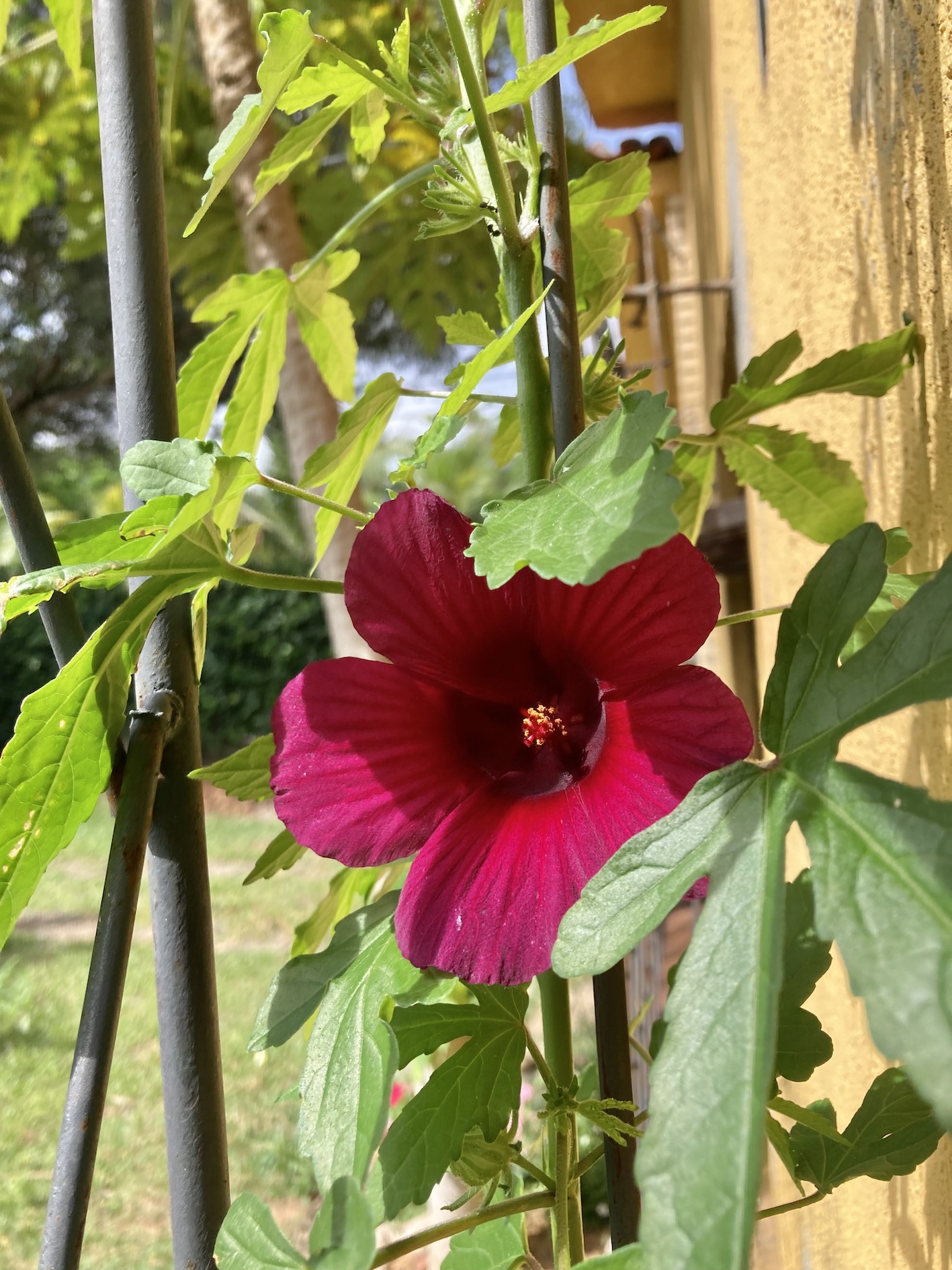 Essa flor aí é uma fonte diária de alegria na minha casa. Ela é fruto de um pequeno furto de galhinhos de um passeio público (roubar plantas, bom demais!) e a bichinha se deu muito bem no meu jardim. Cresceu loucamente e agora coloca pelo menos uma flor por dia, mas na maior parte do dia aparecem três, quatro… Se trata de um Hibiscus Cannabinus (só olhar o formato da folha pra entender o nome), popularmente conhecido com hibisco kenaf (ou, em alguns lugares, como papoula de São Francisco). Na minha lista de pequenas alegrias da vida adulta tem, lá no topo, “acompanhar a brotação das flores do jardim”. E como essas flores duram poucas horas (abrem com o nascer do sol e no início da tarde já murcharam), elas me lembram todos os dias que os prazeres são efêmeros e, justamente por isso, precisam ser plenamente desfrutados.