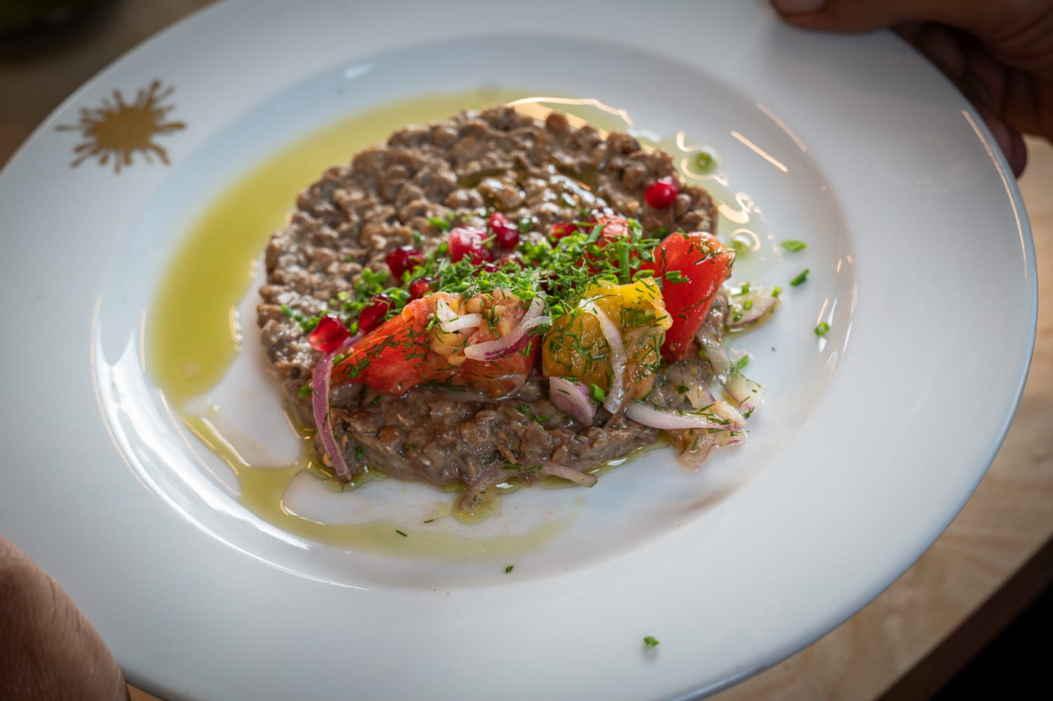 Rummaniyeh é um dos meus pratos favoritos, não apenas por sua simplicidade. Feito de lentilhas e berinjela, combina sabores rústicos com o toque ácido da romã — um equilíbrio de texturas e gostos sem igual. É também um dos poucos pratos que conheço em que a berinjela é fervida, o que lhe confere ainda mais singularidade. Naturalmente vegano, é um prato rico em proteínas e encorpado, uma refeição realmente completa.